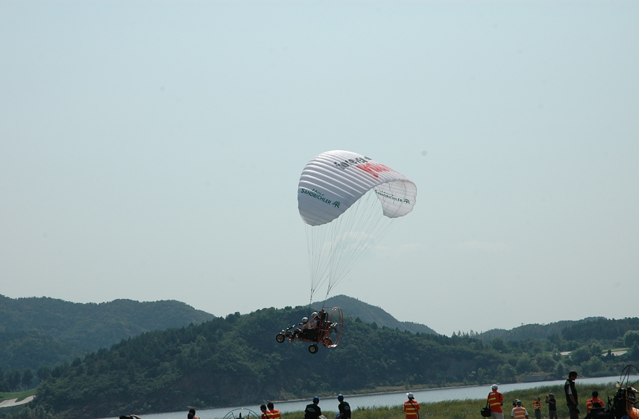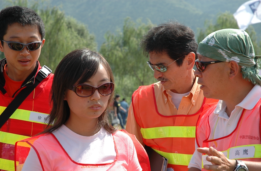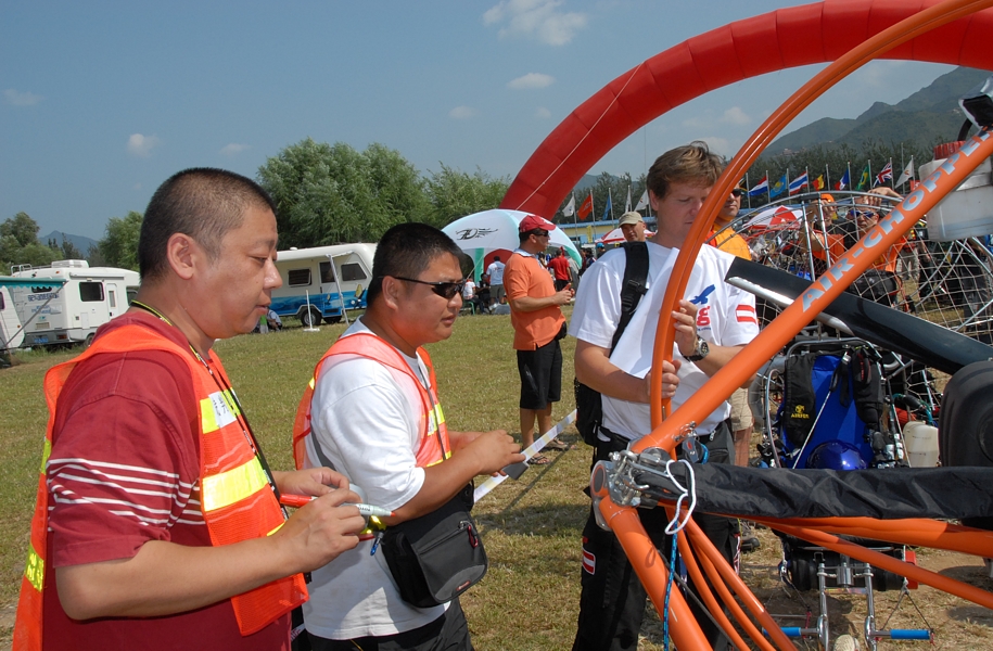 | Abflug Task 2. Das TEAM AUSTRIA beim Abflug mit dem 'Air Chopper' zur 2. Wettkampfaufgabe, einem 'Precision-Task', bei dem es für einen perfekten Start und eine Ziellandung Punkte gibt. Das österr. Duo Stern/Herbig fliegt bei dieser WM Mit einem Leihgerät des österr. Herstellers 'Sunflightcraft', der seine Paratrikes in China produziert. | WM-Wettbewerbsbosse. Letzte Absprachen zwischen der Wettkampfleitung kurz vor dem Start des 'Economy Task'. Der japanische Competition Director Etsushi Matsuo (2. v. r.), Coordinator Assistant Cao Hui (2 v. l.), Chief Marshall Gao Ying (rechts) und Take-Off Chief Marshall Yuan Linchao |