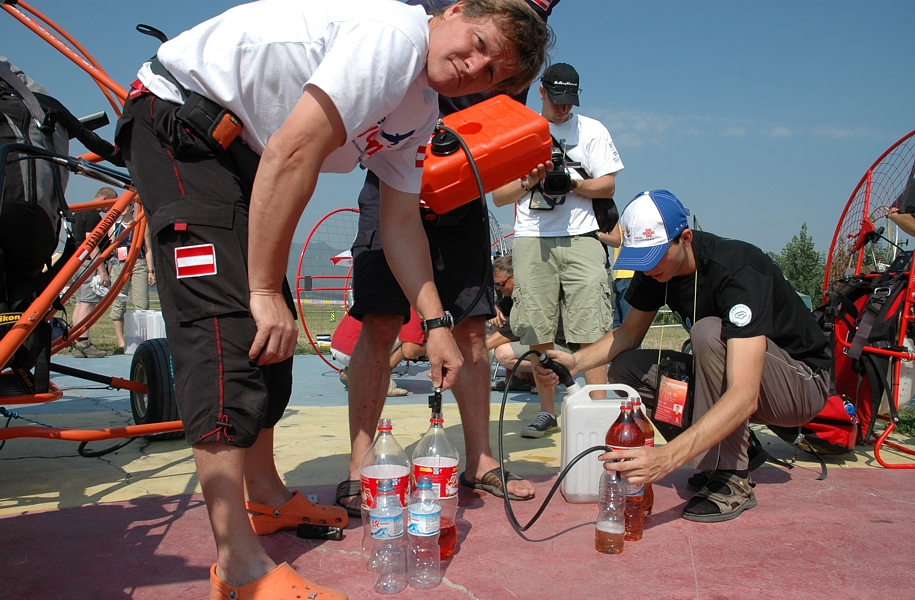 | Fluggeräte-Check. Bei den 'Economy Tasks', das sind Flugaufgaben, wo man mit einer limitierten Menge an Benzin entweder solange wie möglich in der Luft bleiben oder soweit wie möglich fliegen muß, werden die Fluggeräte und die Betankung von den 'Marshalls' genauestens kontrolliert. | Limitierte Betankung. Unter der Kontrolle von Piloten eines anderen Teams wird zuerst der ganze Benzin aus dem Fluggerät entleert und dann die von der Wettkampforganisation vorgegebene Menge - beim Task 2 waren das 5 Liter - genau ausgemessen und in das Fluggerät eingefüllt. Im Bild: der österr. Teamleader Hello Haas (links) und Co-Pilotin Ulli Herbig mit den Piloten des TEAM LITHUANIA als 'Kontrolleure'. |