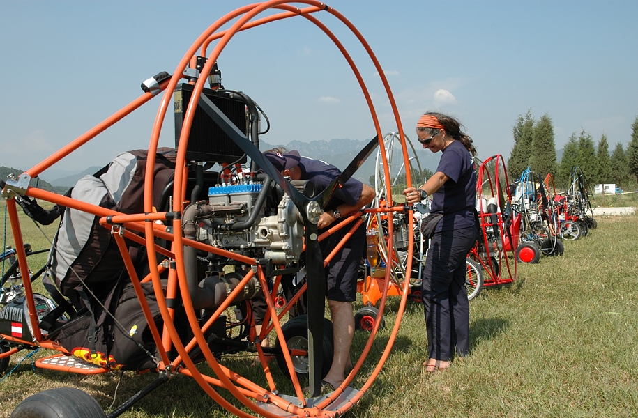 | Tank-Versiegelung. Gleich nachdem das Fluggerät betankt wurde, wird von einem Marshall der Tankdeckel und alle möglichen Öffnungen, wo man Benzin einfüllen und z.B. ein Betankung in der Luft durchführen könnte, versiegelt. Nach der Landung werden diese markierten Stellen dann wieder kontrolliert und auf dem 'Task Sheet' (Wettbewerbsblatt) abgesegnet. | Startaufstellung. Nach dem zeitlich recht aufwendigen und etwas mühsamen Tank-Procedere mußten die Fluggeräte dann in die bewachte 'Parc Ferme' gebracht werden. Die Piloten durften erst kurz vor dem Start zu ihrem Fluggerät. Im Bild: der österr. 'Air Chopper' mit Co-Pilotin Ulli Herbig. |
